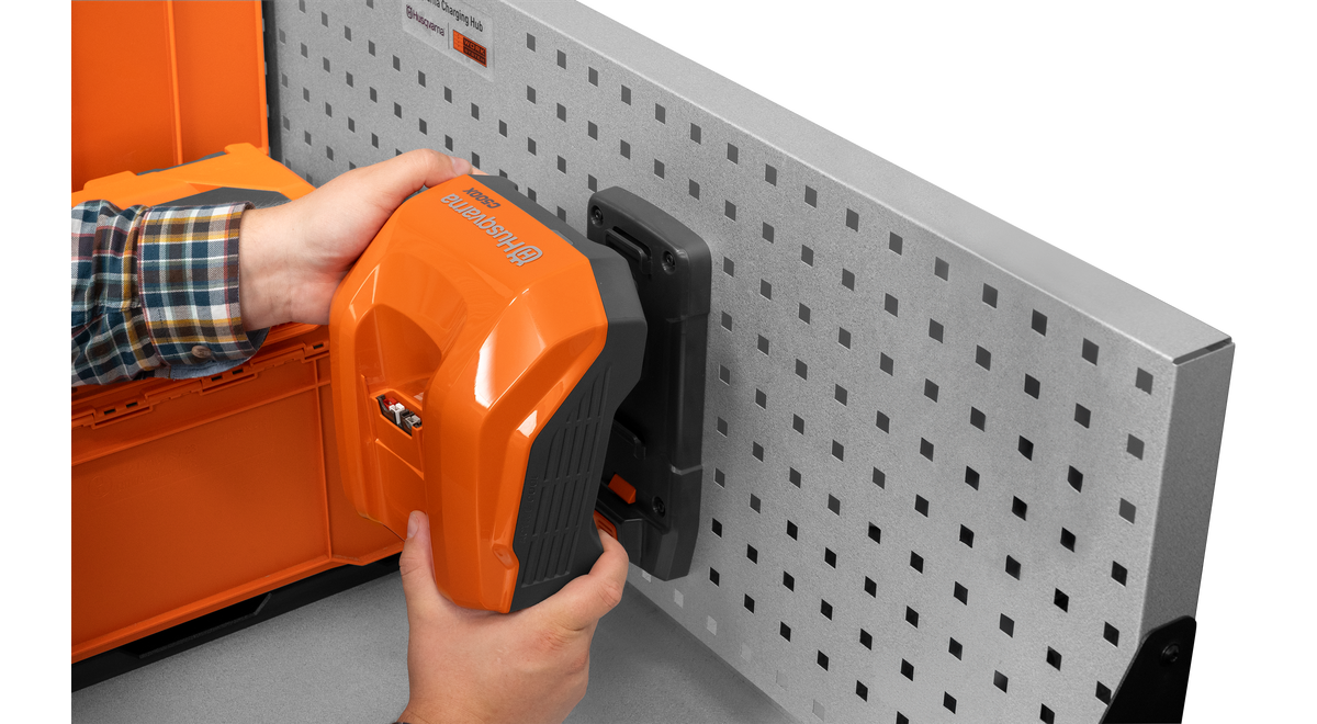 Husqvarna C väggmonteringsplatta är ett slitstarkt och lätt väggfäste som passar Husqvarnas snabbladdare C500X och C750X. Fästet kan enkelt monteras på väggen och ger platsbesparande förvaring av dina laddare.