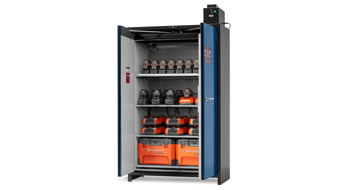 Husqvarnas batteriladdningsskåp L är konstruerat för säker och godkänd förvaring och laddning av litiumjonbatterier. Detta rymliga 230V-skåp erbjuder 90 minuters brandmotstånd från utsidan in och inifrån och ut*. Utrustad med en rökdetektor och en temperatursensor som ger tidig upptäckt av begynnande bränder och ventilationsfel. Brandsläckningssystemet utlöses automatiskt vid brand, medan larmsystemet ser till att larm på plats skickas omgående. Dessutom upprätthåller det aktiva ventilationssystemet optimala förhållanden för batterier och laddare, vilket förhindrar värmeuppbyggnad under laddningsprocessen. Grenuttag och höjdjusterbara hyllor för skräddarsydda förvaringslösningar ingår. – – *Enligt EN-14470-1 och EN-13631