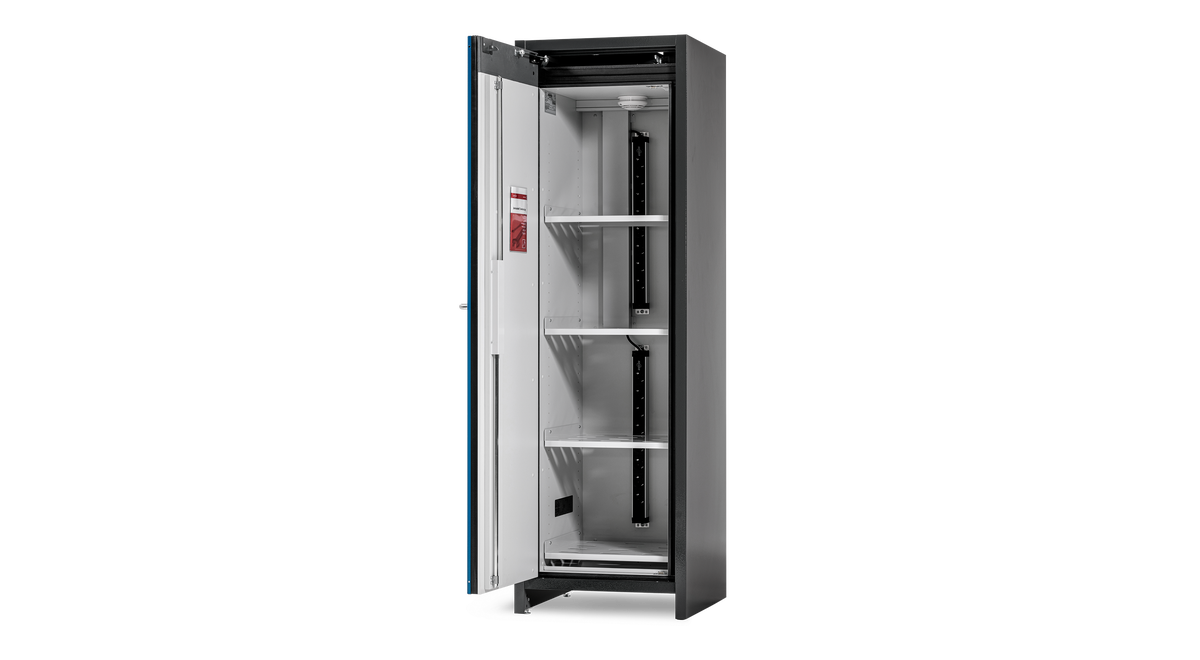 Husqvarnas batteriladdningsskåp M är konstruerat för säker och godkänd förvaring och laddning av litiumjonbatterier. Detta endörrars 230V-skåp erbjuder 90 minuters brandmotstånd från utsidan in och inifrån och ut*. Utrustad med en rökdetektor som ger tidig upptäckt av begynnande bränder och ett larmsystem som säkerställer att larm på plats skickas omgående. Grenuttag och hyllor ingår. – *Enligt EN-14470-1 och EN-13631