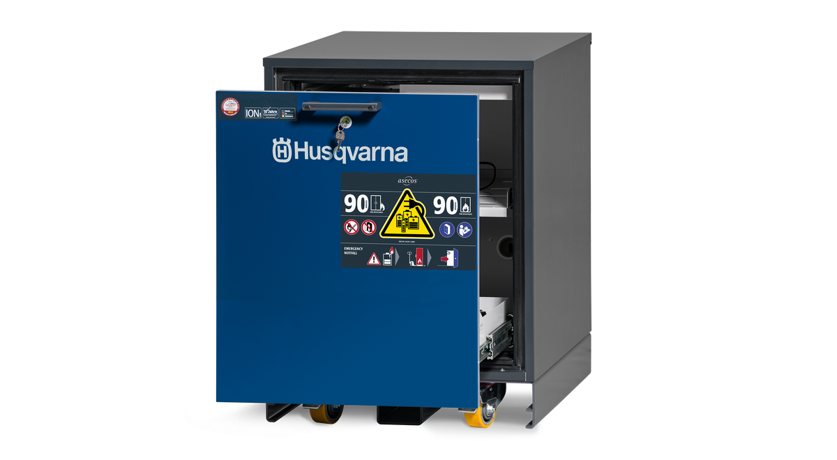 Husqvarnas batteriladdningsskåp S är konstruerat för säker och godkänd förvaring och laddning av litiumjonbatterier. Detta 230V underbänksskåp kan enkelt placeras under bänkskivor tack vare sin låga höjd och erbjuder 90 minuters brandmotstånd från utsidan in och inifrån och ut*. Utrustad med en rökdetektor som ger tidig upptäckt av begynnande bränder och ett larmsystem som säkerställer att larm på plats skickas omgående. Grenuttag och hyllor ingår. – – *Enligt EN-14470-1 och EN-13631