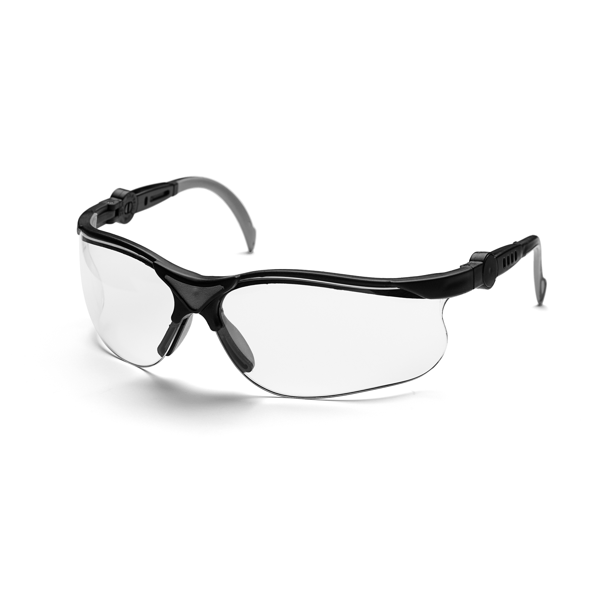 Skyddsglasögon med repfria, klara linser. Med bågar som kan förlängas och linser som kan vinklas. Godkända enligt EN 166, ANSI Z87+.