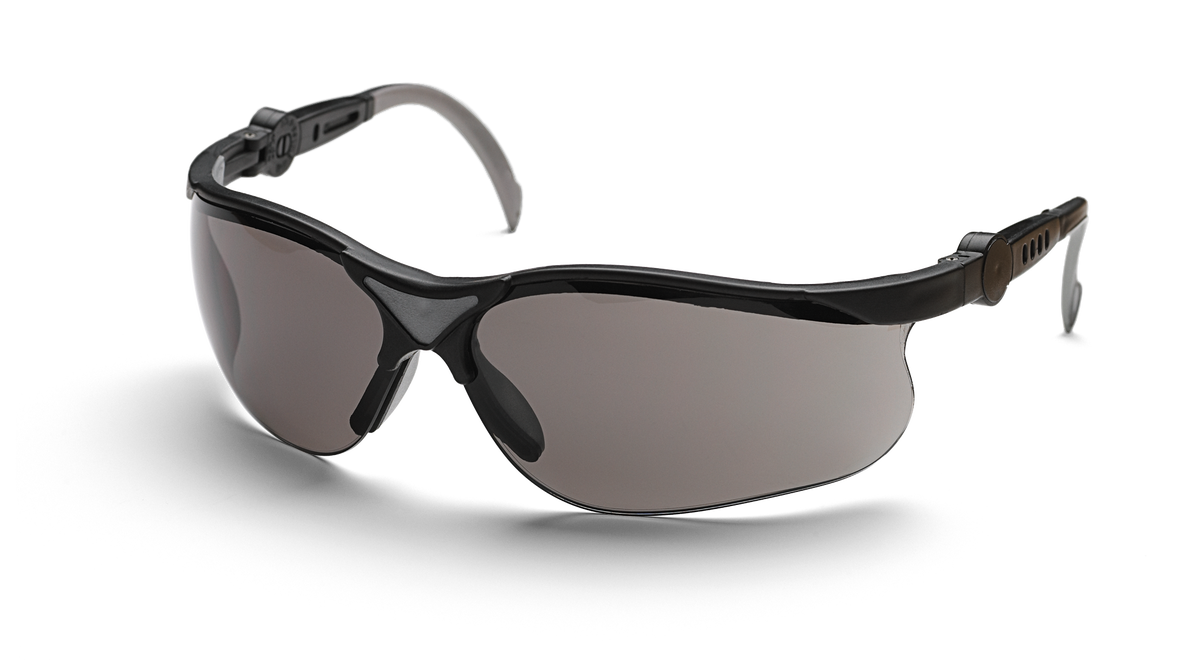 Skyddsglasögon med repfria, mörka linser med UV-skydd för bättre syn i soliga förhållanden. Med bågar som kan förlängas och linser som kan vinklas. Godkända enligt EN 166, ANSI Z87+.