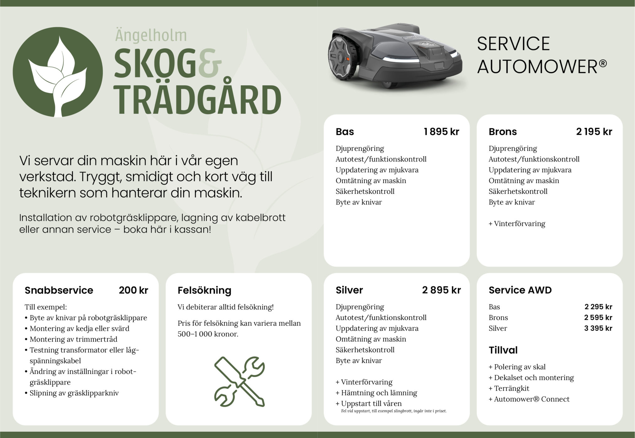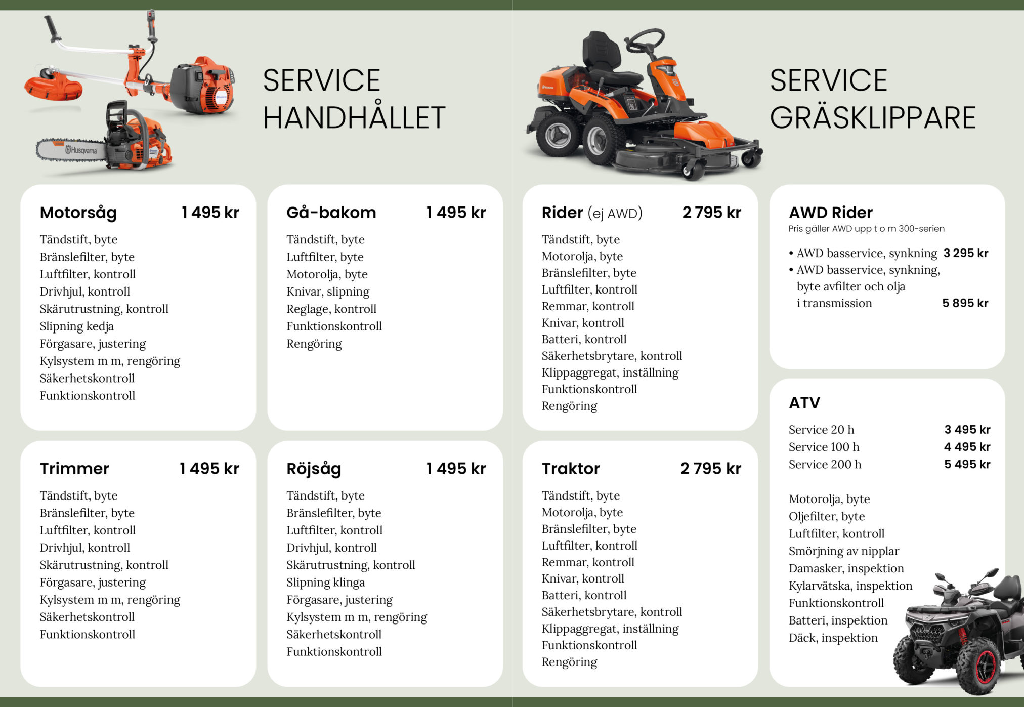 Vi har fasta priser på service av Husqvarnas maskiner – bas, brons och silver.